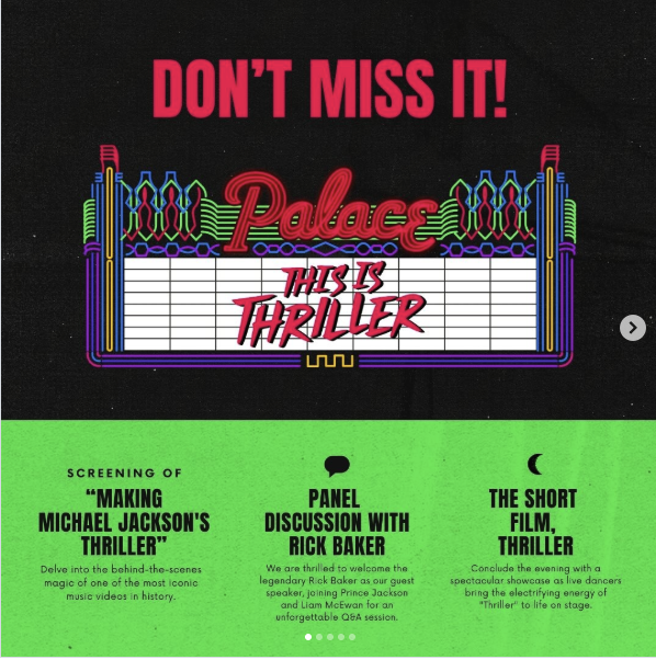 “This is Thriller Night” explores a playful horror style, contrasting the classic blood drip with the vibrant neon of the Palace Theatre venue where the event takes place. We rolled out the blood red carpet for this campaign. It featured a robust social media presence to activate the Jackson fan base and give sneak previews for the big night. A designed a special slide background that looked great on the big screen. Custom keepsakes included T-shirts, Members only jackets, and towels. I recreated the big Thriller sign from the film, and you guessed it, I drew up the Palace Theatre marquee as a vector for crisp scaling.
