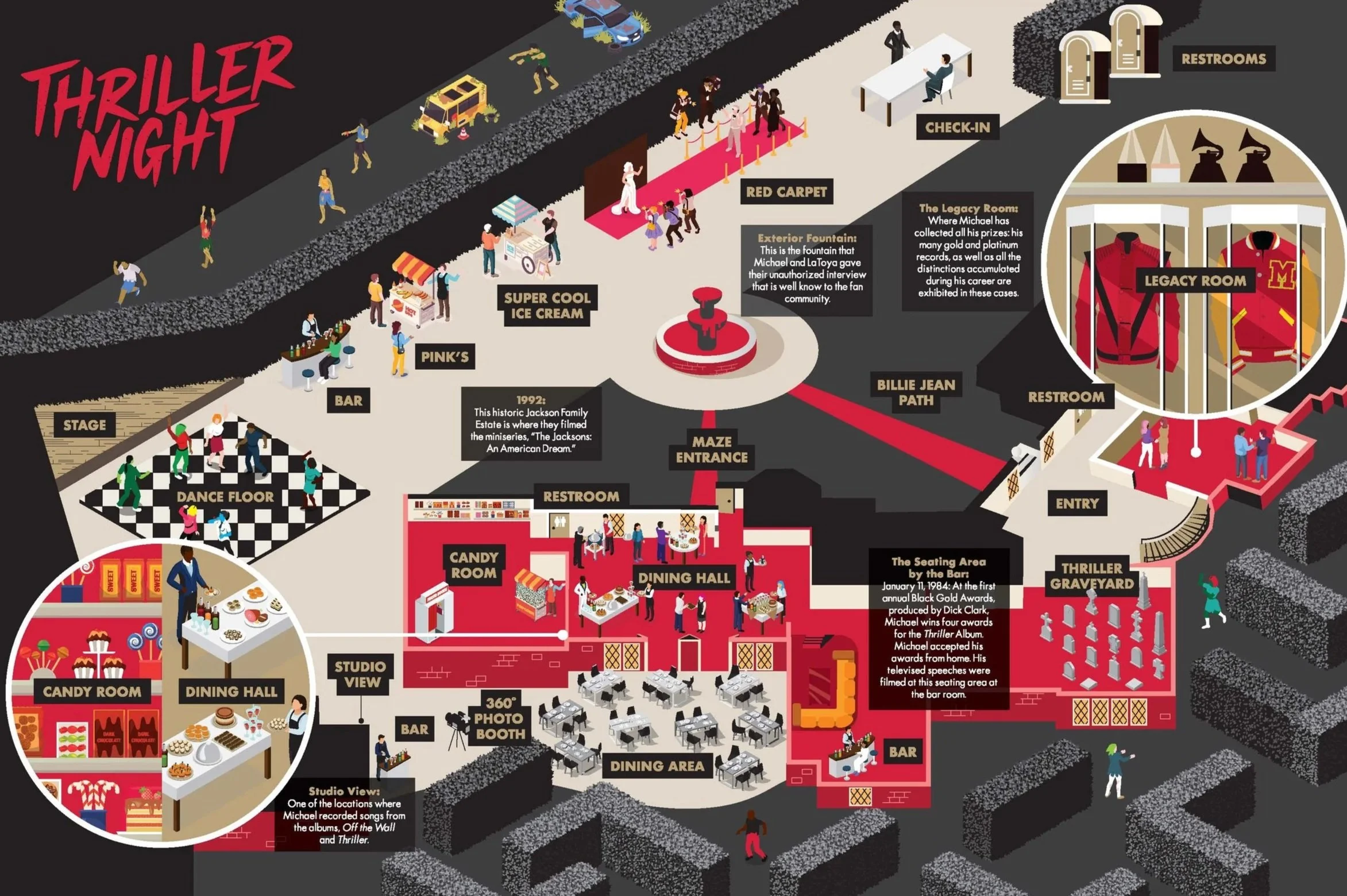 It took a mountain of organizational approaches to satisfy the quick turnarounds demanded by large-scale events. I did this by maintaining strategic pockets of time within my work schedule for last-minute needs. This freed me up to tackle exciting but ambitious concepts, like this custom map of the Hayvenhurst Grounds for Thriller Night.