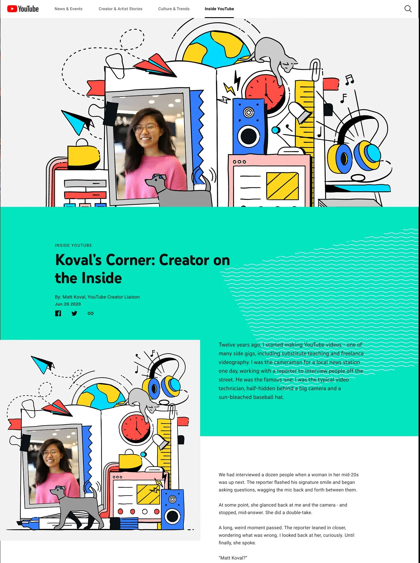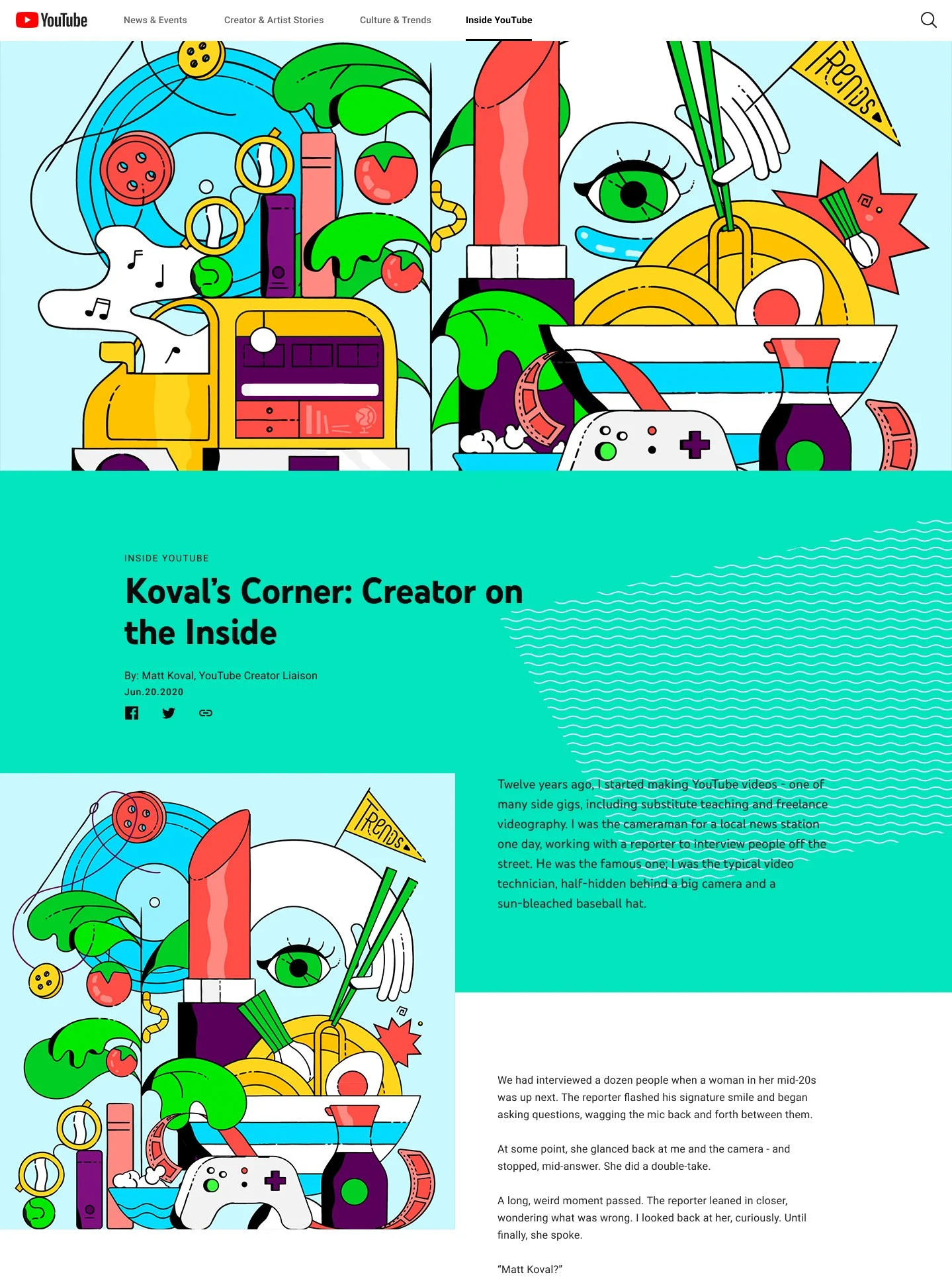 In summer 2020, YouTube relaunched its official blog on a new platform with a refreshed visual identity and partnered with Beutler Ink to create 15 custom illustrations for editorial hero images. These visuals supported a range of blog categories, including Work Diaries and Culture and Trends.